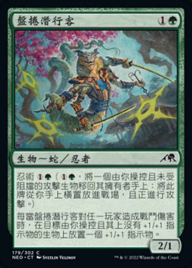| Rules | Ninjutsu (, Return an unblocked attacker you control to hand: Put this card onto the battlefield from your hand tapped and attacking.) Whenever Coiling Stalker deals combat damage to a player, put a +1/+1 counter on target creature you control that doesn't have a +1/+1 counter on it. |