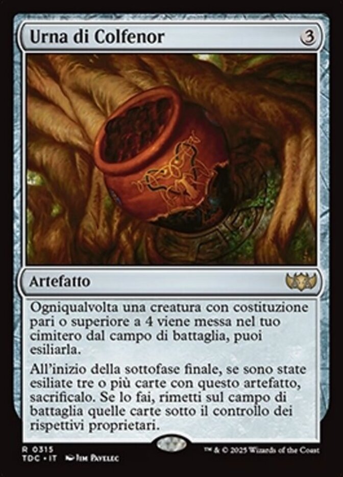 | Rules | Whenever a creature with toughness 4 or greater is put into your graveyard from the battlefield, you may exile it. At the beginning of the end step, if three or more cards have been exiled with Colfenor's Urn, sacrifice it. If you do, return those cards to the battlefield under their owner's control. |