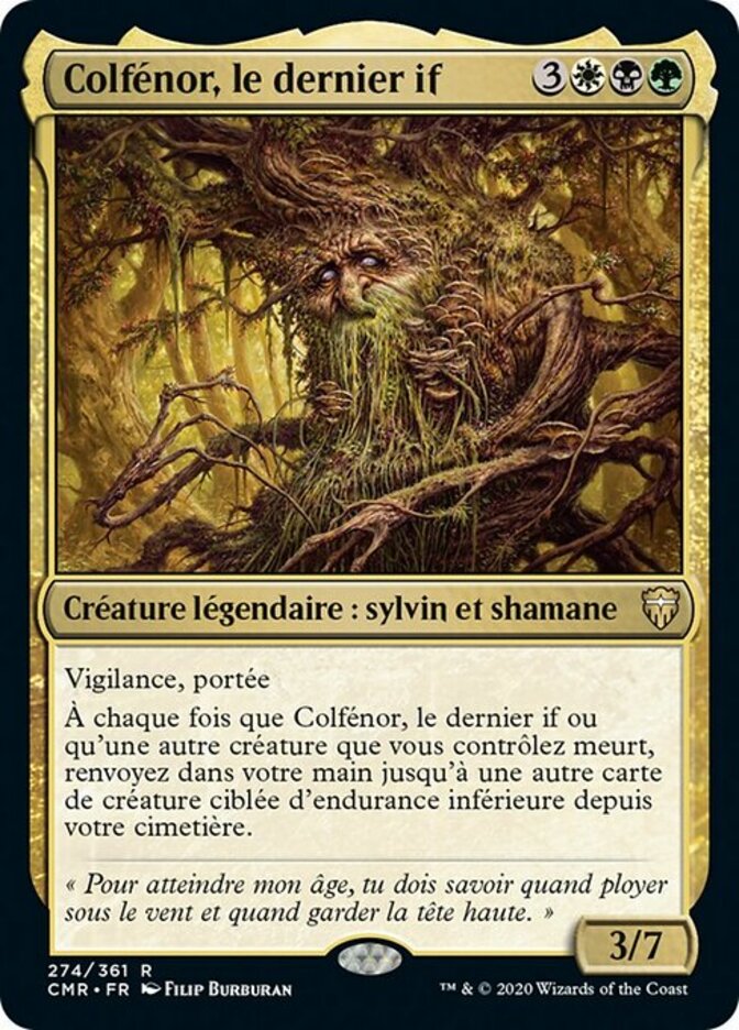 | Rules | Vigilance, reach Whenever Colfenor, the Last Yew or another creature you control dies, return up to one other target creature card with lesser toughness from your graveyard to your hand. |