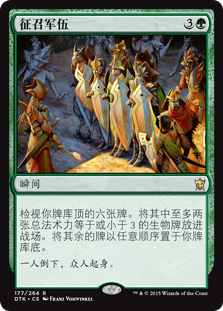 | Rules | Look at the top six cards of your library. Put up to two creature cards with mana value 3 or less from among them onto the battlefield. Put the rest on the bottom of your library in any order. |