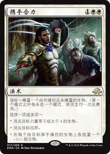 | Rules | Escalate—Tap an untapped creature you control. (Pay this cost for each mode chosen beyond the first.) Choose one or more — • Destroy target creature with power 4 or greater. • Destroy target enchantment. • Put a +1/+1 counter on each creature target player controls. |