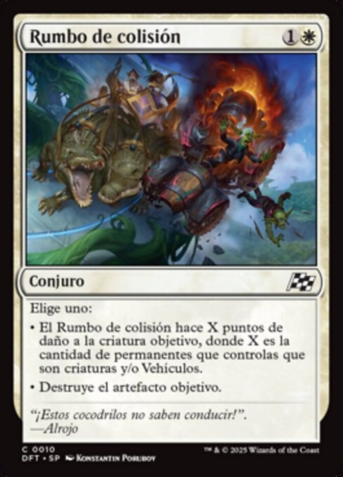 | Rules | Choose one — • Collision Course deals X damage to target creature, where X is the number of permanents you control that are creatures and/or Vehicles. • Destroy target artifact. |
