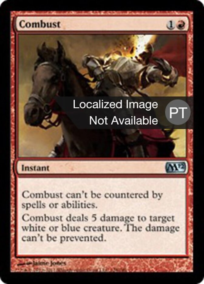 | Rules | This spell can't be countered. Combust deals 5 damage to target white or blue creature. The damage can't be prevented. |