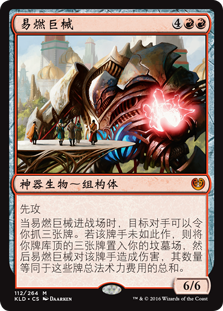 | Rules | First strike When Combustible Gearhulk enters the battlefield, target opponent may have you draw three cards. If the player doesn't, you mill three cards, then Combustible Gearhulk deals damage to that player equal to the total mana value of those cards. |