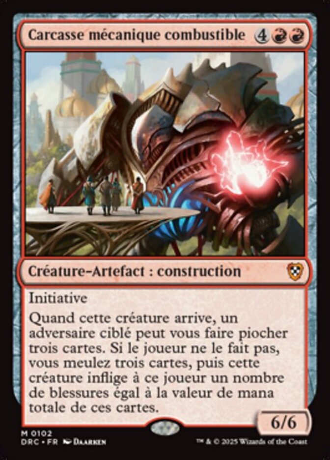 | Rules | First strike When Combustible Gearhulk enters the battlefield, target opponent may have you draw three cards. If the player doesn't, you mill three cards, then Combustible Gearhulk deals damage to that player equal to the total mana value of those cards. |
