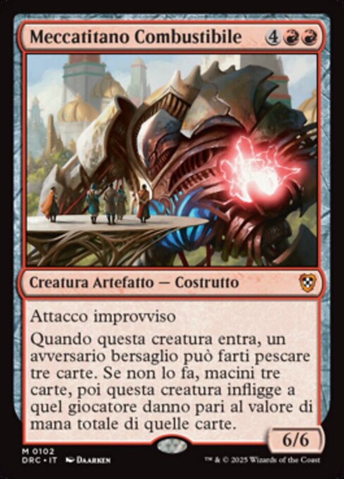 | Rules | First strike When Combustible Gearhulk enters the battlefield, target opponent may have you draw three cards. If the player doesn't, you mill three cards, then Combustible Gearhulk deals damage to that player equal to the total mana value of those cards. |