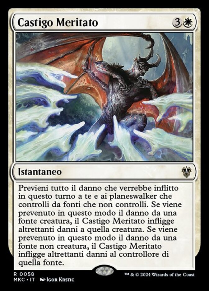 | Rules | Prevent all damage that would be dealt to you and planeswalkers you control this turn by sources you don't control. If damage from a creature source is prevented this way, Comeuppance deals that much damage to that creature. If damage from a noncreature source is prevented this way, Comeuppance deals that much damage to the source's controller. |