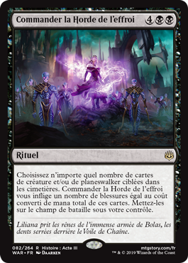 | Rules | Choose any number of target creature and/or planeswalker cards in graveyards. Command the Dreadhorde deals damage to you equal to the total mana value of those cards. Put them onto the battlefield under your control. |