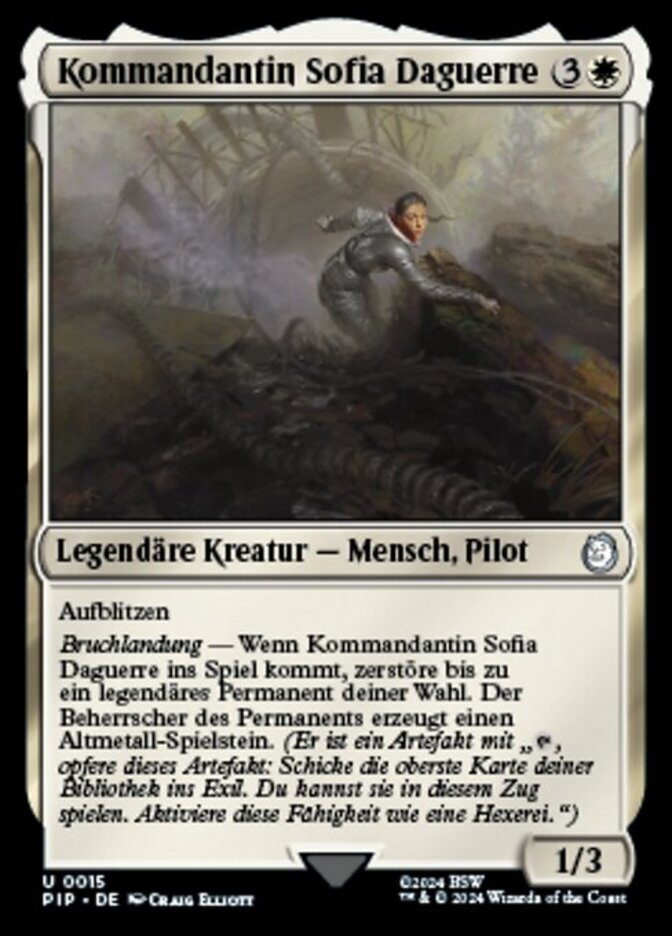 | Rules | Flash Crash Landing — When Commander Sofia Daguerre enters the battlefield, destroy up to one target legendary permanent. That permanent's controller creates a Junk token. (It's an artifact with ", Sacrifice this artifact: Exile the top card of your library. You may play that card this turn. Activate only as a sorcery.") |