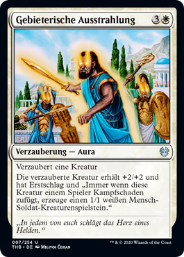 | Rules | Enchant creature Enchanted creature gets +2/+2 and has first strike and "Whenever this creature deals combat damage to a player, create a 1/1 white Human Soldier creature token." |