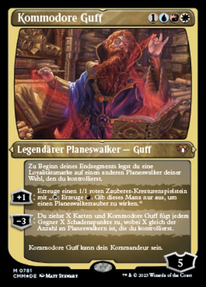 | Rules | At the beginning of your end step, put a loyalty counter on another target planeswalker you control. +1: Create a 1/1 red Wizard creature token with ": Add . Spend this mana only to cast a planeswalker spell." −3: You draw X cards and Commodore Guff deals X damage to each opponent, where X is the number of planeswalkers you control. Commodore Guff can be your commander. |