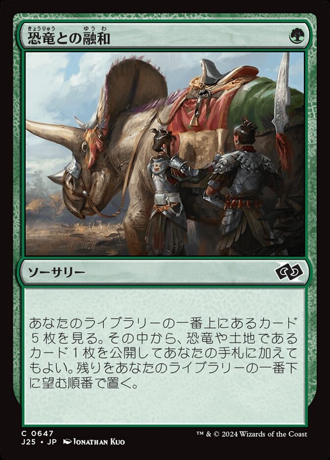 | Rules | Look at the top five cards of your library. You may reveal a Dinosaur or land card from among them and put it into your hand. Put the rest on the bottom of your library in any order. |