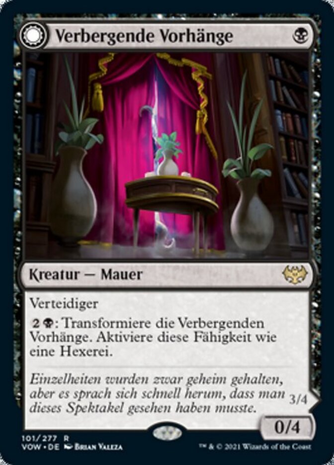 | Rules | Defender : Transform Concealing Curtains. Activate only as a sorcery. // Menace When this creature transforms into Revealing Eye, target opponent reveals their hand. You may choose a nonland card from it. If you do, that player discards that card, then draws a card. |
