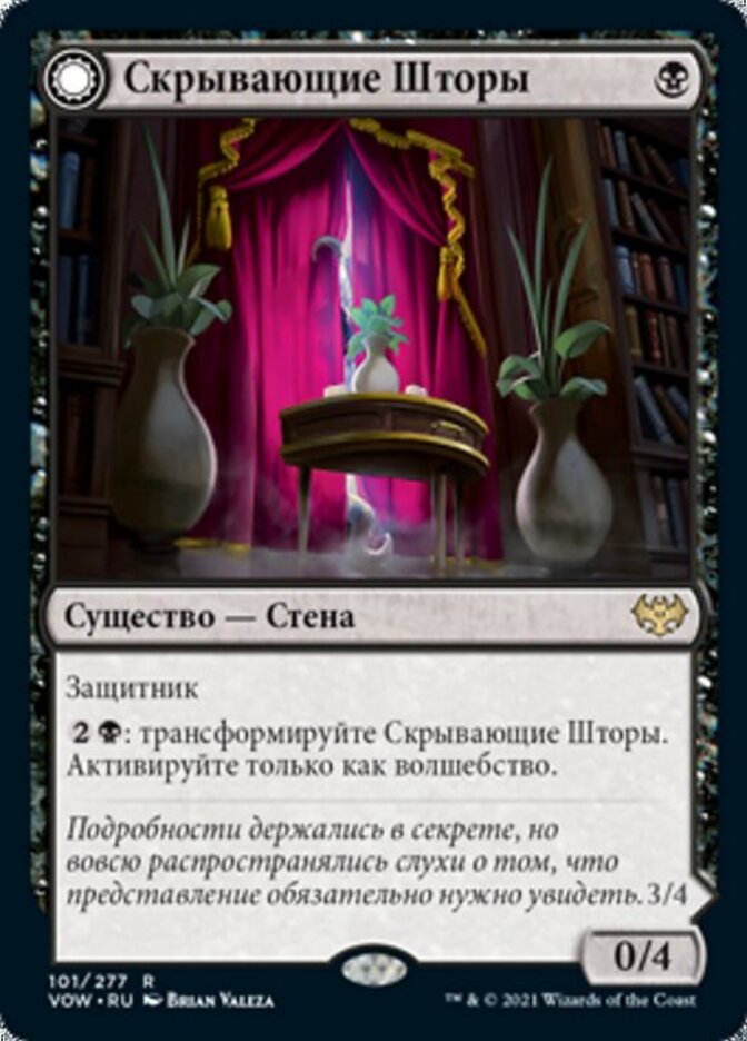 | Rules | Defender : Transform Concealing Curtains. Activate only as a sorcery. // Menace When this creature transforms into Revealing Eye, target opponent reveals their hand. You may choose a nonland card from it. If you do, that player discards that card, then draws a card. |