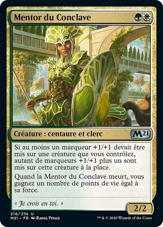 | Rules | If one or more +1/+1 counters would be put on a creature you control, that many plus one +1/+1 counters are put on that creature instead. When Conclave Mentor dies, you gain life equal to its power. |