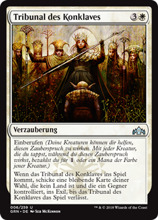 | Rules | Convoke (Your creatures can help cast this spell. Each creature you tap while casting this spell pays for or one mana of that creature's color.) When Conclave Tribunal enters the battlefield, exile target nonland permanent an opponent controls until Conclave Tribunal leaves the battlefield. |