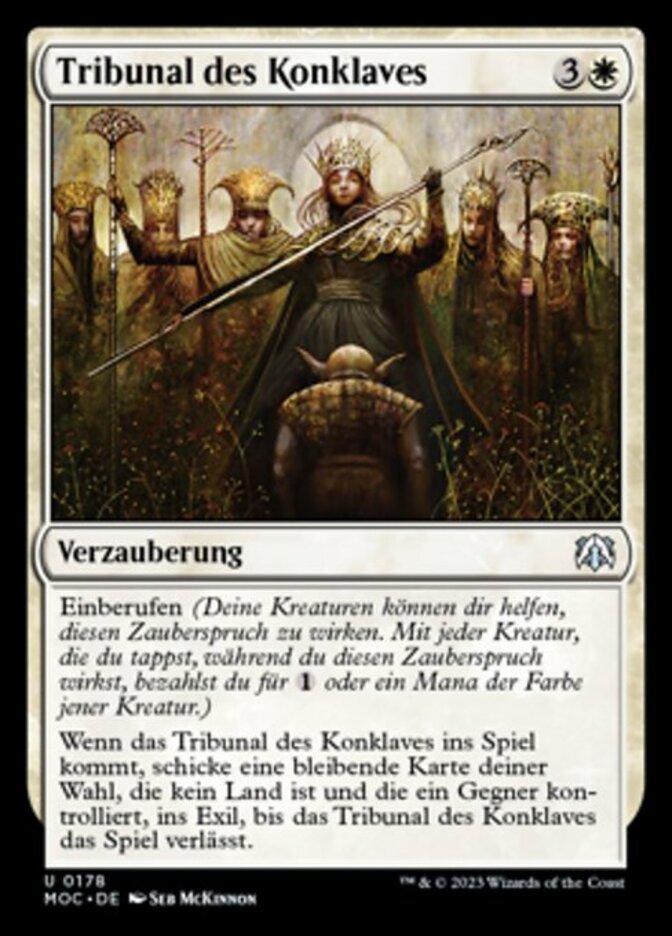 | Rules | Convoke (Your creatures can help cast this spell. Each creature you tap while casting this spell pays for or one mana of that creature's color.) When Conclave Tribunal enters the battlefield, exile target nonland permanent an opponent controls until Conclave Tribunal leaves the battlefield. |