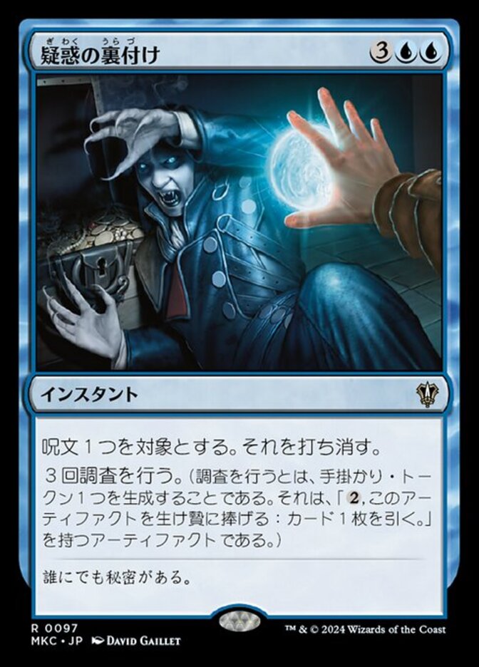 | Rules | Counter target spell. Investigate three times. (To investigate, create a colorless Clue artifact token with ", Sacrifice this artifact: Draw a card.") |