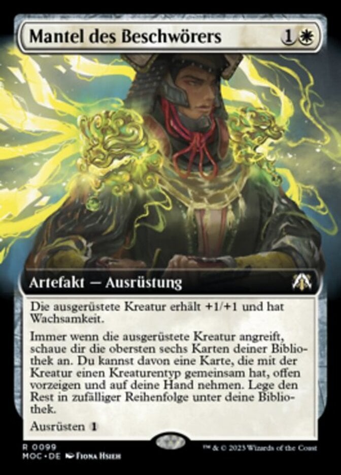 | Rules | Equipped creature gets +1/+1 and has vigilance. Whenever equipped creature attacks, look at the top six cards of your library. You may reveal a card that shares a creature type with that creature from among them and put it into your hand. Put the rest on the bottom of your library in a random order. Equip |