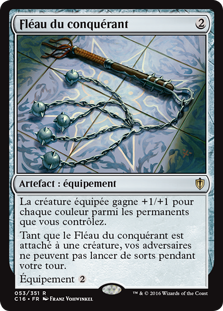 | Rules | Equipped creature gets +1/+1 for each color among permanents you control. As long as Conqueror's Flail is attached to a creature, your opponents can't cast spells during your turn. Equip |