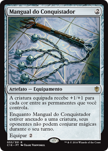 | Rules | Equipped creature gets +1/+1 for each color among permanents you control. As long as Conqueror's Flail is attached to a creature, your opponents can't cast spells during your turn. Equip |