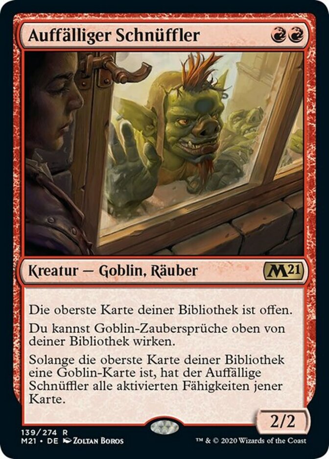 | Rules | Play with the top card of your library revealed. You may cast Goblin spells from the top of your library. As long as the top card of your library is a Goblin card, Conspicuous Snoop has all activated abilities of that card. |