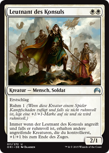 | Rules | First strike Renown 1 (When this creature deals combat damage to a player, if it isn't renowned, put a +1/+1 counter on it and it becomes renowned.) Whenever Consul's Lieutenant attacks, if it's renowned, other attacking creatures you control get +1/+1 until end of turn. |