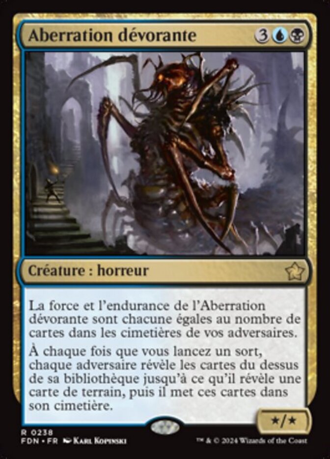 | Rules | Consuming Aberration's power and toughness are each equal to the number of cards in your opponents' graveyards. Whenever you cast a spell, each opponent reveals cards from the top of their library until they reveal a land card, then puts those cards into their graveyard. |