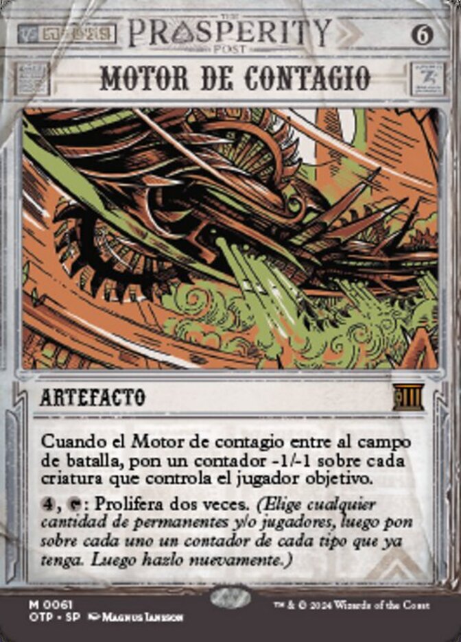 | Rules | When Contagion Engine enters the battlefield, put a -1/-1 counter on each creature target player controls. , : Proliferate, then proliferate again. (Choose any number of permanents and/or players, then give each another counter of each kind already there. Then do it again.) |