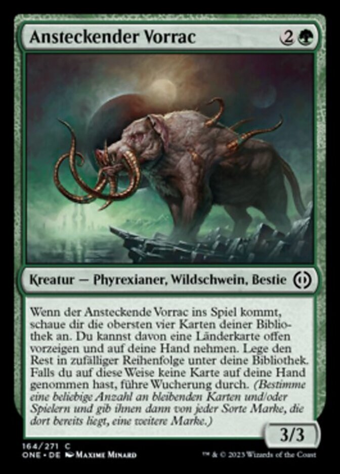 | Rules | When Contagious Vorrac enters the battlefield, look at the top four cards of your library. You may reveal a land card from among them and put it into your hand. Put the rest on the bottom of your library in a random order. If you didn't put a card into your hand this way, proliferate. (Choose any number of permanents and/or players, then give each another counter of each kind already there.) |