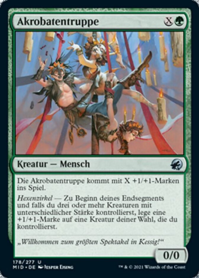 | Rules | Contortionist Troupe enters the battlefield with X +1/+1 counters on it. Coven — At the beginning of your end step, if you control three or more creatures with different powers, put a +1/+1 counter on target creature you control. |