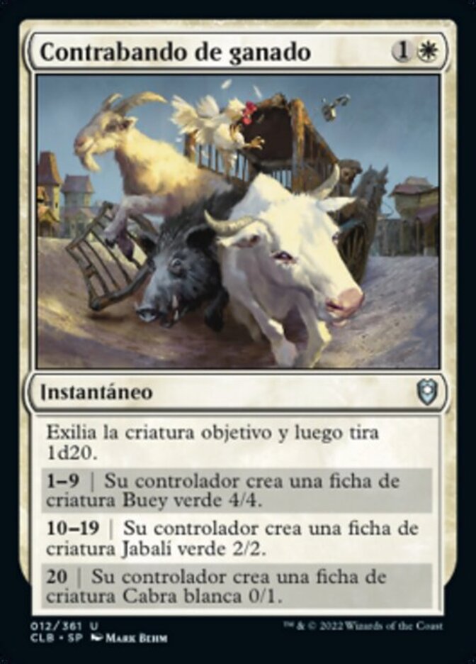 | Rules | Exile target creature, then roll a d20. 1-9 | Its controller creates a 4/4 green Ox creature token. 10-19 | Its controller creates a 2/2 green Boar creature token. 20 | Its controller creates a 0/1 white Goat creature token. |