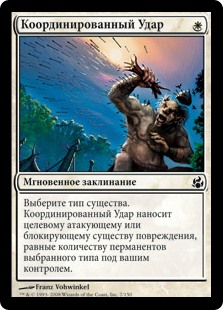 | Rules | Choose a creature type. Coordinated Barrage deals damage to target attacking or blocking creature equal to the number of permanents you control of the chosen type. |