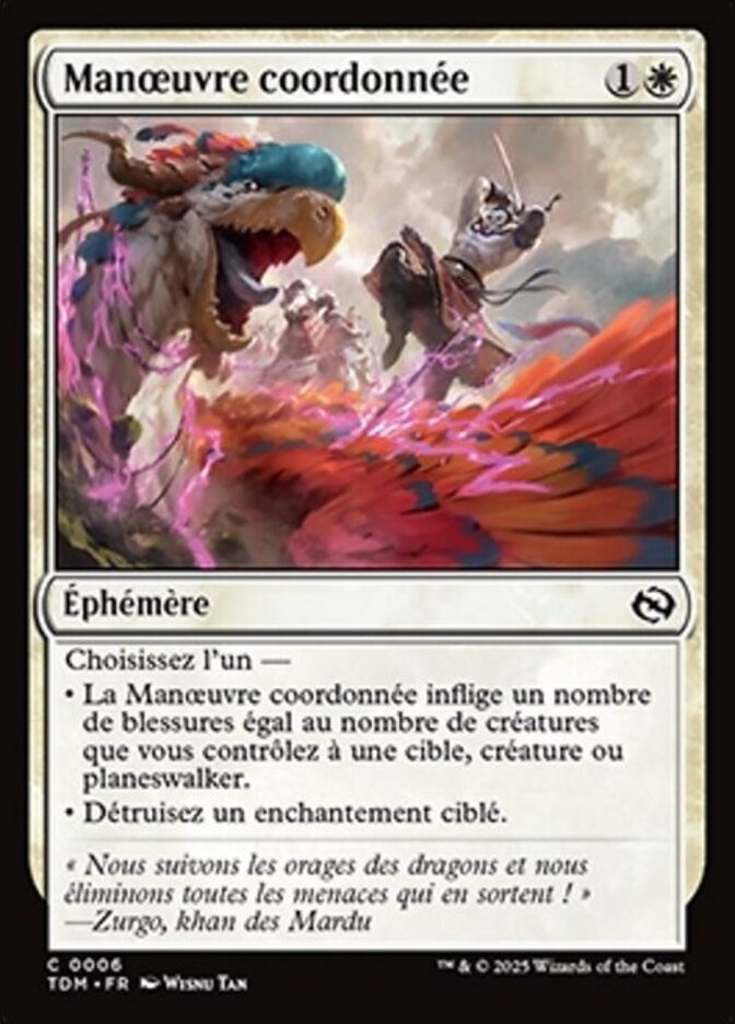 | Rules | Choose one — • Coordinated Maneuver deals damage equal to the number of creatures you control to target creature or planeswalker. • Destroy target enchantment. |