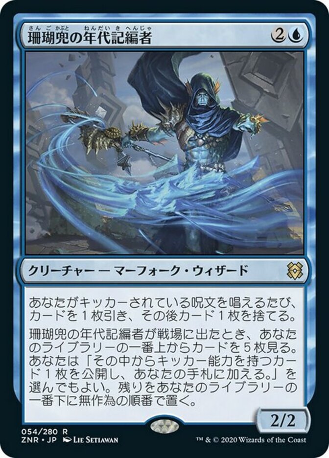 | Rules | Whenever you cast a kicked spell, draw a card, then discard a card. When Coralhelm Chronicler enters the battlefield, look at the top five cards of your library. You may reveal a card with a kicker ability from among them and put it into your hand. Put the rest on the bottom of your library in a random order. |