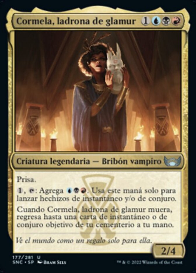 | Rules | Haste , : Add . Spend this mana only to cast instant and/or sorcery spells. When Cormela, Glamour Thief dies, return up to one target instant or sorcery card from your graveyard to your hand. |