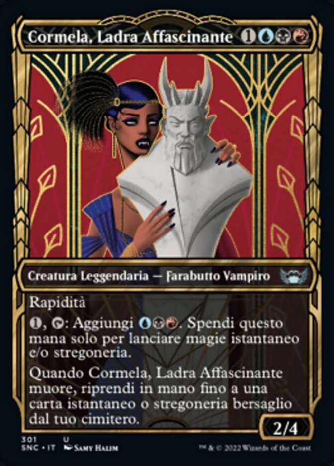 | Rules | Haste , : Add . Spend this mana only to cast instant and/or sorcery spells. When Cormela, Glamour Thief dies, return up to one target instant or sorcery card from your graveyard to your hand. |
