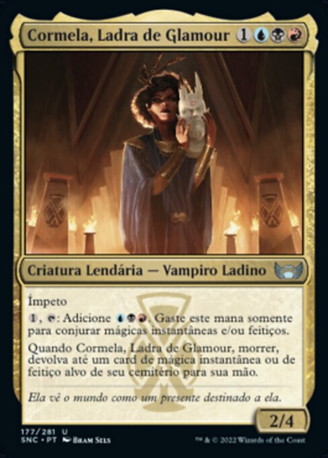 | Rules | Haste , : Add . Spend this mana only to cast instant and/or sorcery spells. When Cormela, Glamour Thief dies, return up to one target instant or sorcery card from your graveyard to your hand. |
