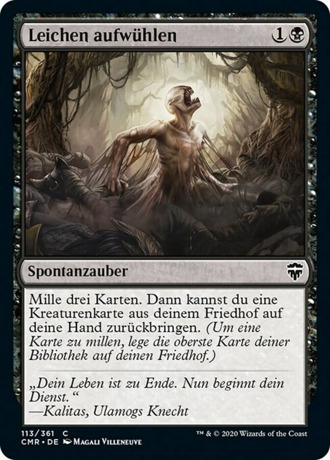| Rules | Mill three cards, then you may return a creature card from your graveyard to your hand. (To mill a card, put the top card of your library into your graveyard.) |