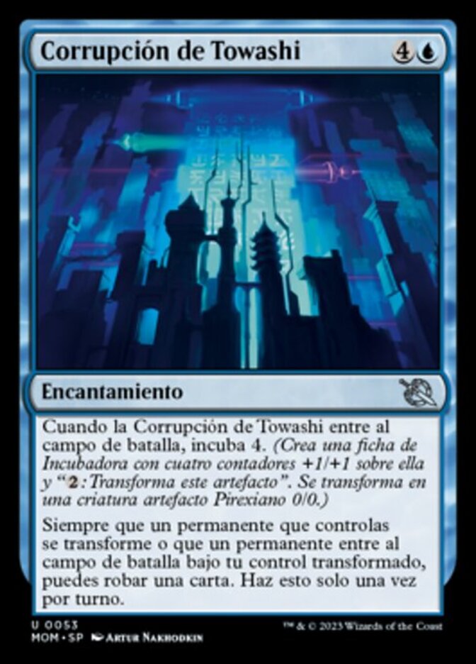 | Rules | When Corruption of Towashi enters the battlefield, incubate 4. (Create an Incubator token with four +1/+1 counters on it and ": Transform this artifact." It transforms into a 0/0 Phyrexian artifact creature.) Whenever a permanent you control transforms or a permanent enters the battlefield under your control transformed, you may draw a card. Do this only once each turn. |
