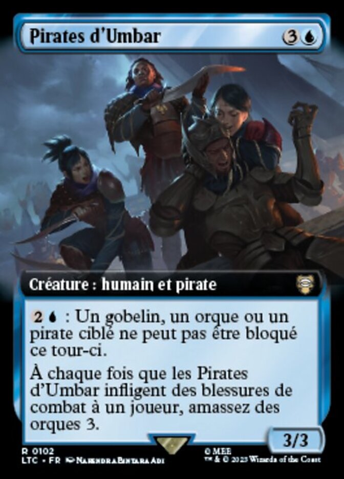 | Rules | : Target Goblin, Orc, or Pirate can't be blocked this turn. Whenever Corsairs of Umbar deals combat damage to a player, amass Orcs 3. (Put three +1/+1 counters on an Army you control. It's also an Orc. If you don't control an Army, create a 0/0 black Orc Army creature token first.) |