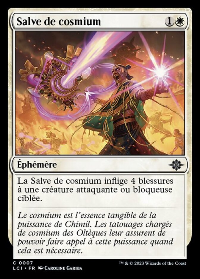 | Rules | Cosmium Blast deals 4 damage to target attacking or blocking creature. |