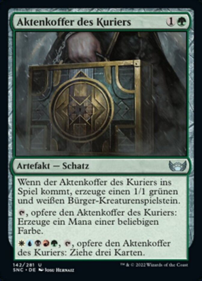 | Rules | When Courier's Briefcase enters the battlefield, create a 1/1 green and white Citizen creature token. , Sacrifice Courier's Briefcase: Add one mana of any color. , , Sacrifice Courier's Briefcase: Draw three cards. |