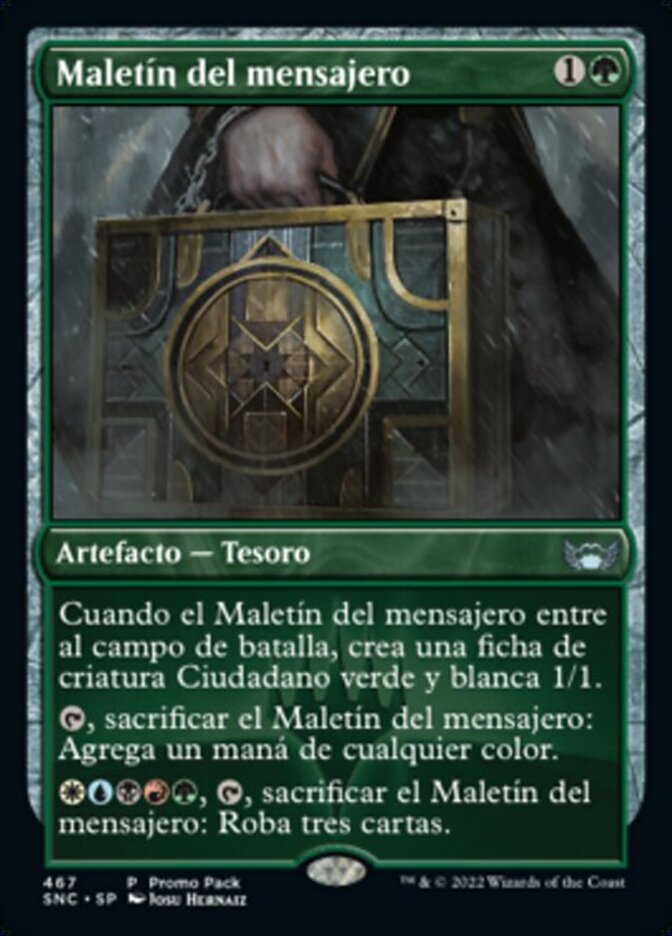 | Rules | When Courier's Briefcase enters the battlefield, create a 1/1 green and white Citizen creature token. , Sacrifice Courier's Briefcase: Add one mana of any color. , , Sacrifice Courier's Briefcase: Draw three cards. |