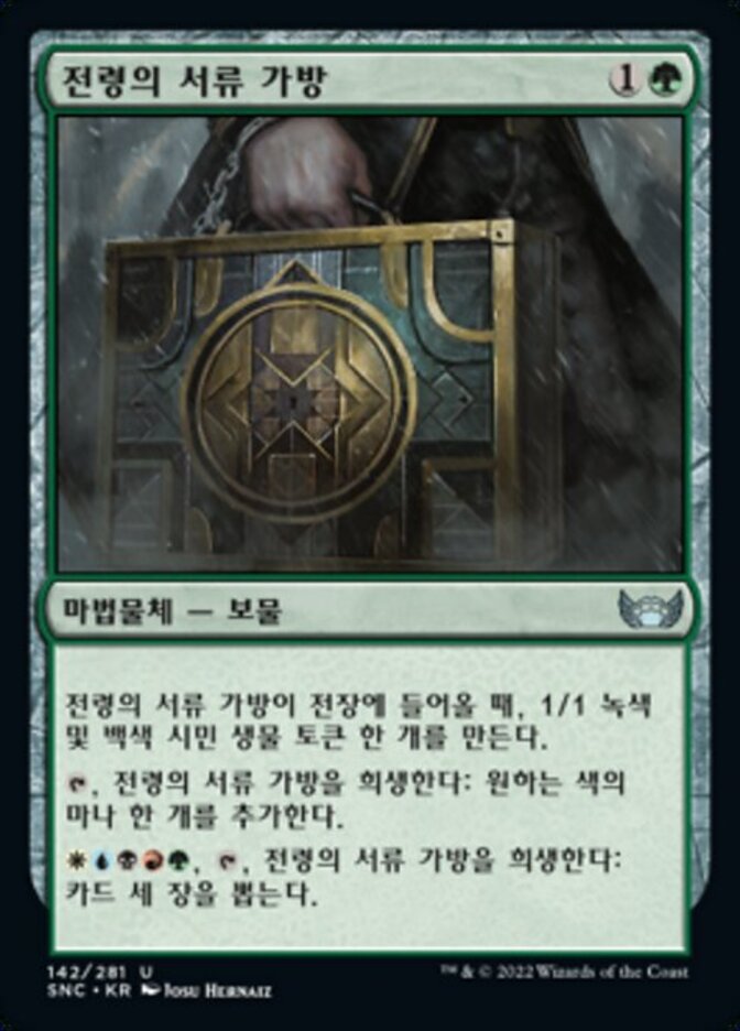 | Rules | When Courier's Briefcase enters the battlefield, create a 1/1 green and white Citizen creature token. , Sacrifice Courier's Briefcase: Add one mana of any color. , , Sacrifice Courier's Briefcase: Draw three cards. |