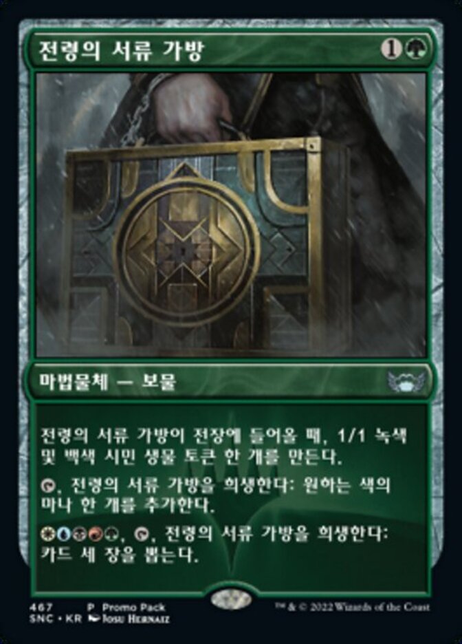 | Rules | When Courier's Briefcase enters the battlefield, create a 1/1 green and white Citizen creature token. , Sacrifice Courier's Briefcase: Add one mana of any color. , , Sacrifice Courier's Briefcase: Draw three cards. |