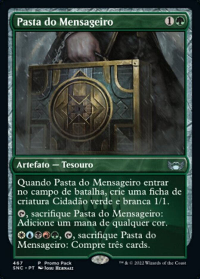 | Rules | When Courier's Briefcase enters the battlefield, create a 1/1 green and white Citizen creature token. , Sacrifice Courier's Briefcase: Add one mana of any color. , , Sacrifice Courier's Briefcase: Draw three cards. |