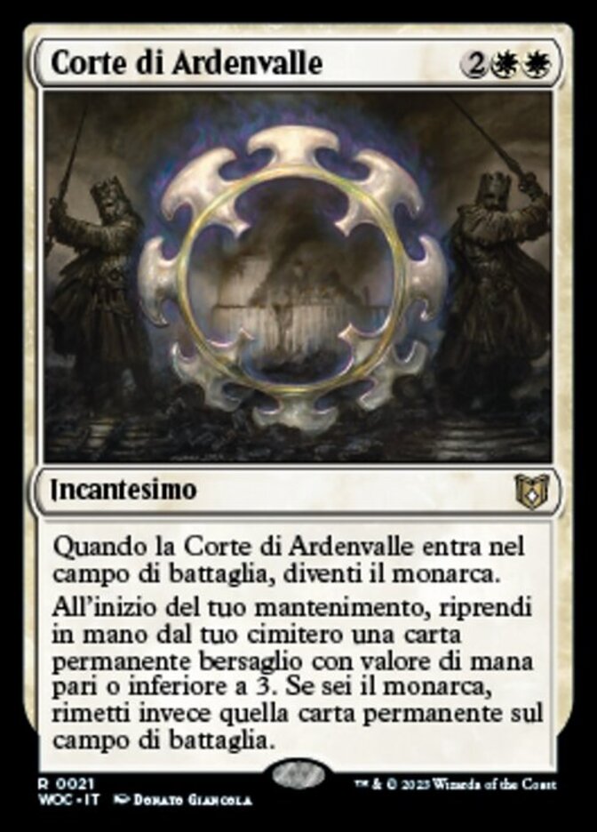 | Rules | When Court of Ardenvale enters the battlefield, you become the monarch. At the beginning of your upkeep, return target permanent card with mana value 3 or less from your graveyard to your hand. If you're the monarch, return that permanent card to the battlefield instead. |