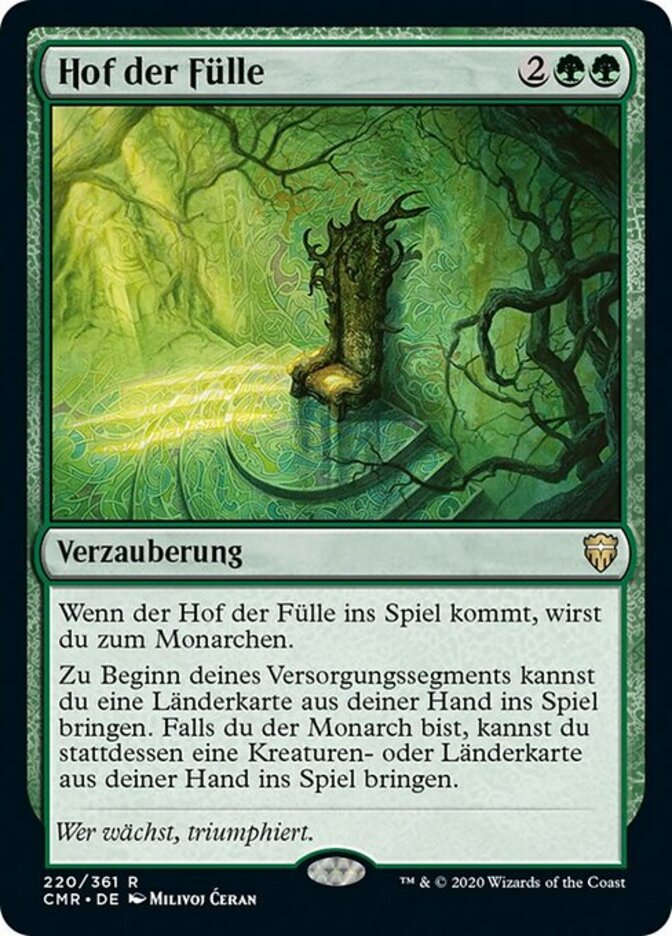 | Rules | When Court of Bounty enters the battlefield, you become the monarch. At the beginning of your upkeep, you may put a land card from your hand onto the battlefield. If you're the monarch, instead you may put a creature or land card from your hand onto the battlefield. |