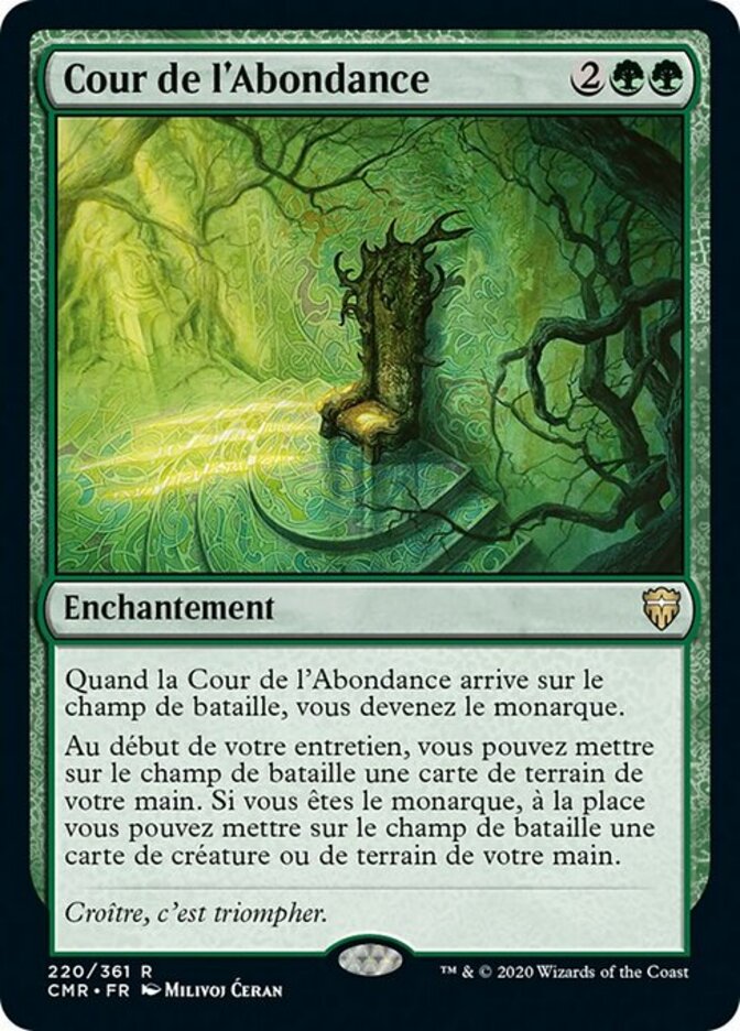 | Rules | When Court of Bounty enters the battlefield, you become the monarch. At the beginning of your upkeep, you may put a land card from your hand onto the battlefield. If you're the monarch, instead you may put a creature or land card from your hand onto the battlefield. |